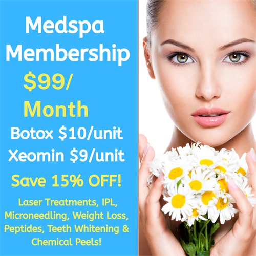 Medspa services include Laser Hair Removal, Laser Skin Resurfacing, Laser Tattoo Removal, Laser Facials, Laser spider vein removal, IPL Photofacial, Chemical Peels, Facials, Diamond Glow Facials, Procell Microneedling with Exosomes (Botox Alternative!), Botox, Xeomin, Perfect Derma Chemical Peels, Natural Teeth Whitening, and Microneedling